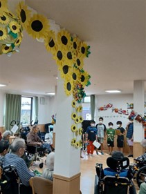 玄関ホールに響く元気いっぱいの歌声に、入居者様も自然と笑顔に😊。